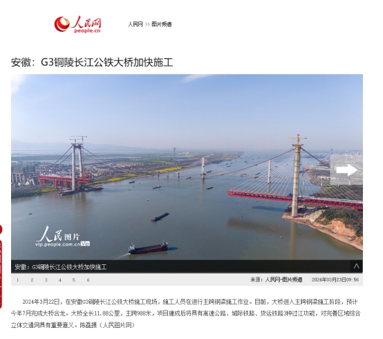 3月22日,人民網(wǎng)報(bào)道由銅陵交投集團(tuán)投資建設(shè)、中鐵大橋局承建的G3銅陵長(zhǎng)江公鐵大橋項(xiàng)目建設(shè)進(jìn)展情況,具體原文如下: