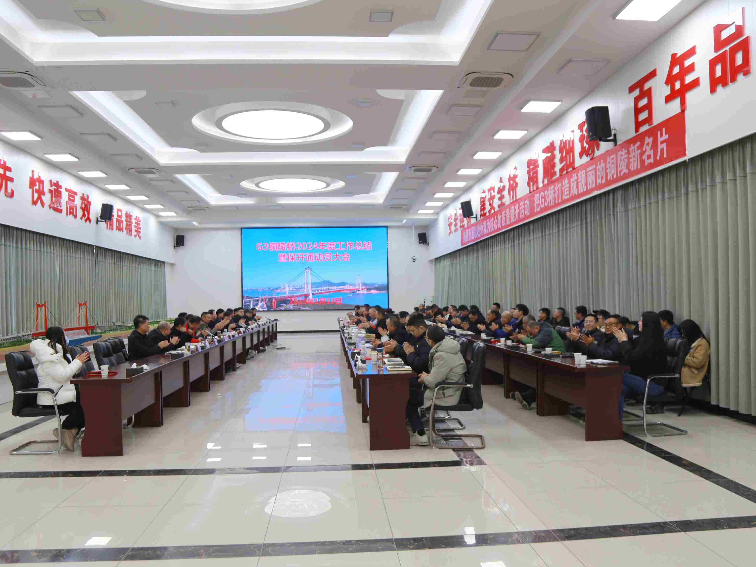 2025年1月13日下午,G3銅陵長江公鐵大橋項(xiàng)目部會(huì)議室隆重召開“G3銅陵長江公鐵大橋2024年度工作總結(jié)暨2025年保通動(dòng)員活動(dòng)大會(huì)”。集團(tuán)公司黨委副書記、總經(jīng)理龍道寧,集團(tuán)公司黨委委員、副總經(jīng)理湯世才出席會(huì)議,中鐵大橋局集團(tuán)副總經(jīng)理羅兵,中鐵大橋局四分公司黨委書記、執(zhí)行董事王立忠,中鐵大橋局G3橋項(xiàng)目總指揮劉幸福,以及各參建單位相關(guān)負(fù)責(zé)人參加會(huì)議。