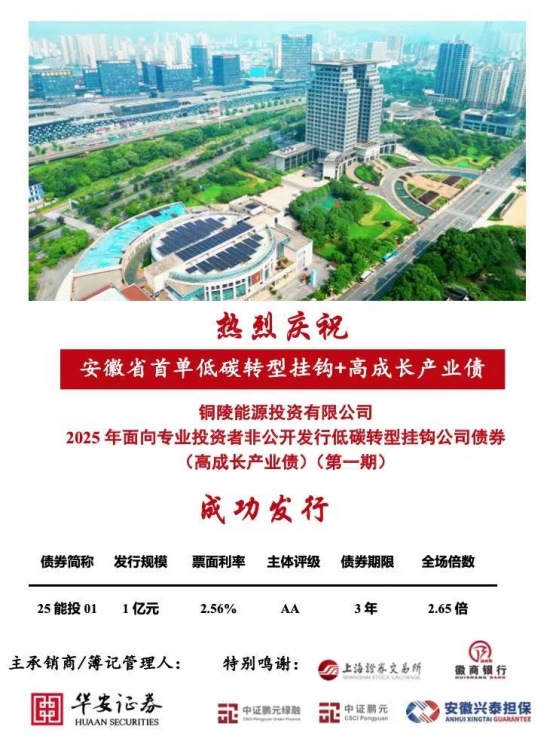 12月19日,銅陵市能源投資有限公司(以下簡(jiǎn)稱“銅陵能投公司”)在上海證券交易所成功發(fā)行2025年第一期低碳轉(zhuǎn)型掛鉤公司債券“25能投01”。本次發(fā)行是安徽省首單低碳轉(zhuǎn)型掛鉤公司債+高成長(zhǎng)產(chǎn)業(yè)債,也是銅陵能投公司在資本市場(chǎng)的首次亮相,額度3億元,本期發(fā)行1億元。期限3年,票面利率2.56%,全場(chǎng)認(rèn)購(gòu)倍數(shù)2.65倍。債券票面利率較1年期貸款市場(chǎng)報(bào)價(jià)利率3.0%下降44個(gè)基點(diǎn),綜合節(jié)約融資成本約132萬元,標(biāo)志著銅陵能投公司成功將金融創(chuàng)新、綠色發(fā)展以及產(chǎn)業(yè)轉(zhuǎn)型深度融合,獲得債券市場(chǎng)投資者的踴躍認(rèn)購(gòu)。