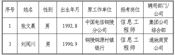 根據(jù)《銅陵市交通投資有限責(zé)任公司招聘人員公告》,現(xiàn)將信息工程師擬聘用人員名單公示如下: