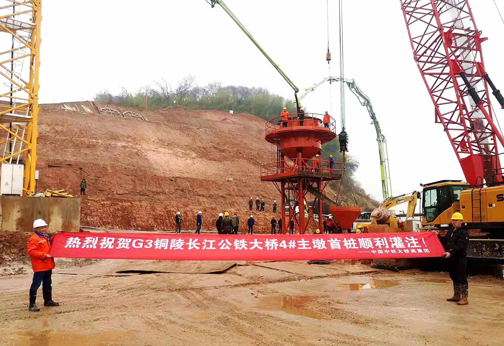 G3銅陵長(zhǎng)江公鐵大橋4號(hào)主墩鉆孔樁共64根,按照摩擦樁設(shè)計(jì),樁基礎(chǔ)按照行列式和梅花形組合布置,每根鉆孔樁長(zhǎng)度均為79米,樁徑均為3米,樁底需進(jìn)入中等膠結(jié)泥質(zhì)砂巖層。據(jù)G3銅陵長(zhǎng)江公鐵大橋二分部經(jīng)理刁新國(guó)介紹:“G3銅陵長(zhǎng)江公鐵大橋的建設(shè)工期十分緊張,4號(hào)主墩是全橋的關(guān)鍵控制點(diǎn)之一,工期尤為緊張,我們必須嚴(yán)格按照計(jì)劃施工。為了按時(shí)完成基礎(chǔ)階段施工任務(wù),在萬(wàn)家歡聚的春節(jié)假期,許多大橋建設(shè)者舍小家為大家,堅(jiān)守工作崗位,卯足干勁,加班加點(diǎn),終于換來(lái)了4號(hào)主墩施工突破性進(jìn)展。此次成功灌注,為后續(xù)的樁基施工積累了寶貴經(jīng)驗(yàn),也極大的鼓舞了士氣?!?